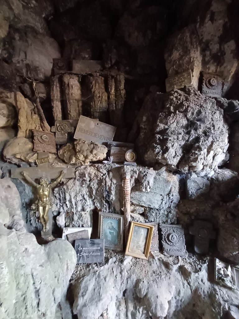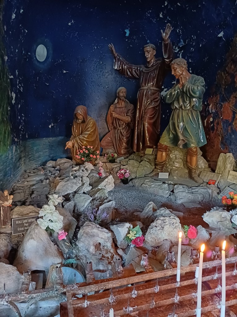 Het Mariabeeld alleen weegt al 1200 kg. Het gewicht van de totale constructie wordt op 300 ton geschat. Binnenin de grot zijn twee taferelen met wonderen uitgebeeld uit het leven van de Heilige Antonius. Ook de schepper van de grot is vertegenwoordigd, knielend en biddend voor zijn indrukwekkende creatie. Zijn lichaam is begraven in de grot. Beslist de moeite om te zien! Het mooie lieve dorpje is ook het vertrekpunt van zeer vele wandelingen.