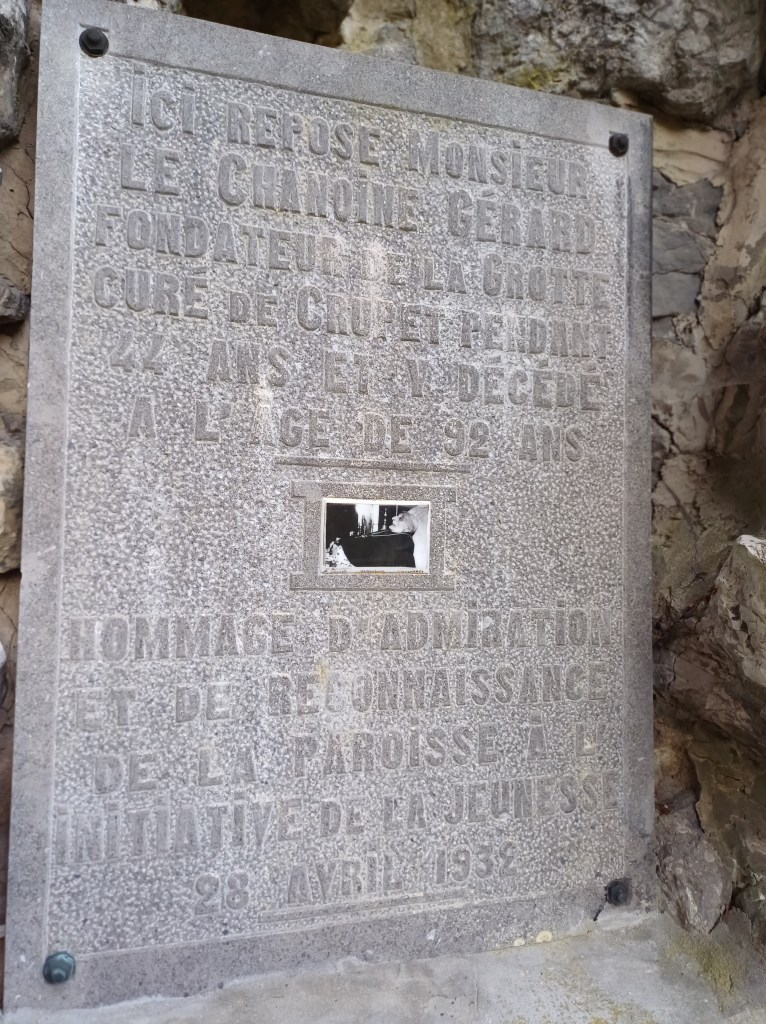 Ici repose Monsieur Le Chamoine Gérard, fondateur de la grotte, curé de Crupet pendant 44 ans et y décédé à l’âge de 92 ans.