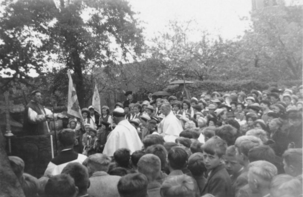 Op foto 03 is te zien dat alle schoolkinderen van het dorp opgetrommeld waren voor de plechtigheid. Er was zelfs een groep geĂĽniformeerde meisjes, vermoedelijk een zangkoor. Het weer was wisselvallig, want er waren enkele personen met een open paraplu.
