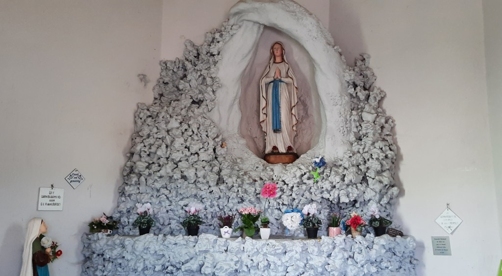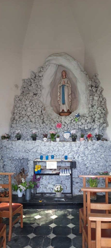 Binnenin een mooie Lourdesgrot, met Bernadetje en diverse heiligenbeelden.