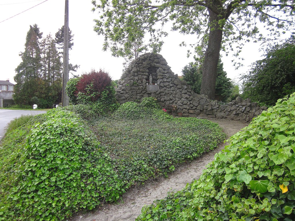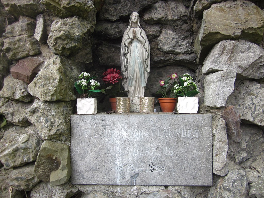 Deze foto’s zijn genomen bij avond. De Lourdesgrot is dan mooi verlicht en valt op vanop de Grote Baan. Er staat een bank om te mediteren en er is gelegenheid om een kaarsje te branden. Goed verzorgd.