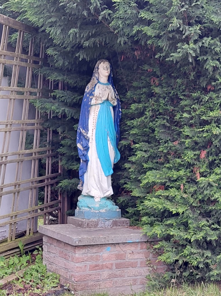 Wel dit mooi Lourdesbeeld gevonden in de tuin van de pastorie langs de straatzijde, vlakbij de kerk, in de Willem Van Moerbekestraat nr. 15.