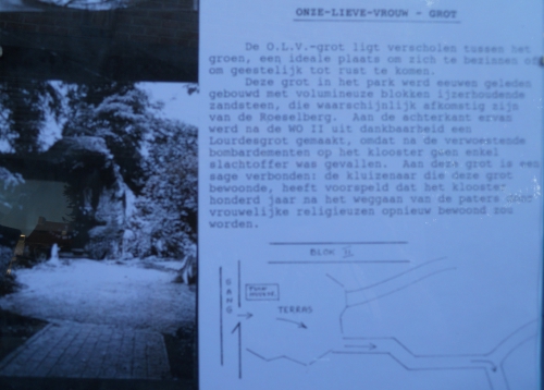 De Onze-Lieve-Vrouwegrot ligt verscholen tussen het groen, een ideale plaats om zich te bezinnen, om geestelijk tot rust te komen. Deze grot in het park werd eeuwen geleden gebouwd met volumineuze blokken ijzerhoudende zandsteen, die waarschijnlijk afkomstig was van de Roeselberg. Aan de achterkant werd na W.O.II uit dankbaarheid een Lourdesgrot gemaakt, omdat na de verwoestende bombardementen op de klooster geen enkel slachtoffer was gevallen. Aan deze grot is een sage verbonden: de kluizenaar die deze grot bewoonde, heeft voorspeld dat het klooster honderd jaar na het weggaan van de paters door vrouwelijke religieuzen opnieuw bewoond zou worden.