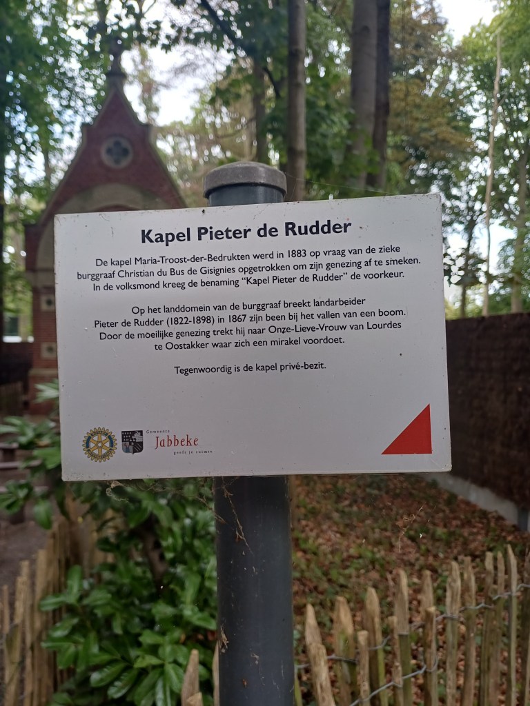 De kapel wordt ook de “Pieter De Rudderkapel” genoemd, omdat men ze bouwde op de plaats waar deze Jabbekenaar, werkzaam op het kasteeldomein bij Alberic Du Bus, in 1875 door een vallende boom werd getroffen. Hij werd door een bedevaart naar Oostakker genezen.