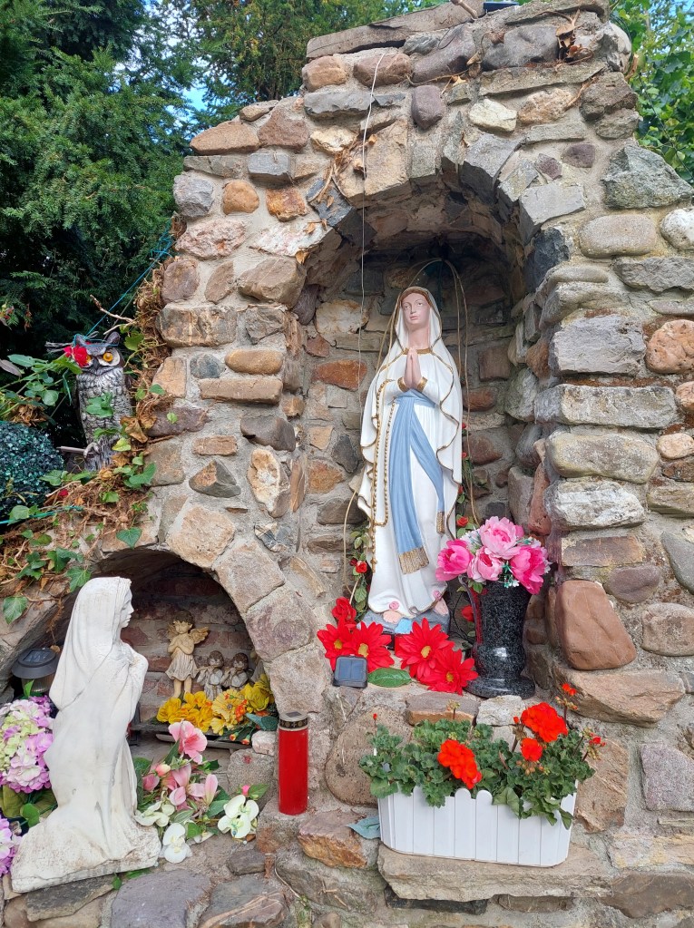 Mooi Lourdesgrotje in de achtertuin bij Alain en Lucienne Maes-Michaux (Brouwerijstraat 17 te Eliksem, deelgemeente van Landen). Tel. 0468/330191