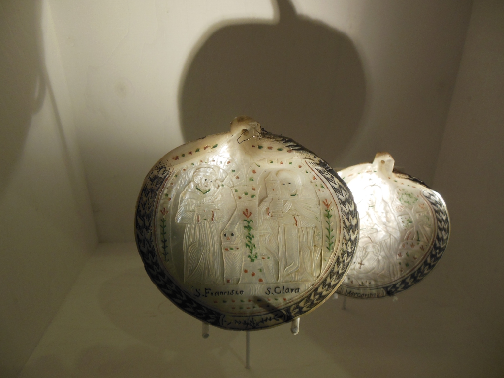 Franciscus en Clara op een Sint-Jacobsschelp.