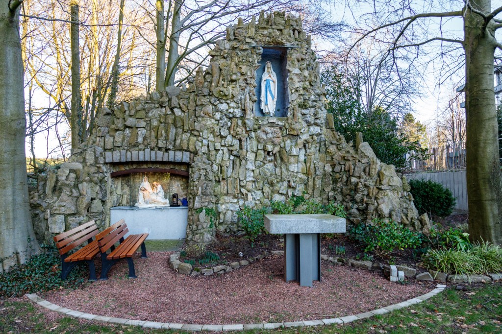 In der Nähe des Pflege- und Altersheims [i]Marienheim[/i] bei Raeren befindet sich in einem Wäldchen ein [link:Kalvarienberg]Kalvarienberg[/link] mit Darstellungen des Leidenswegs Christi, den Kreuzwegstationen. Oben auf dem Hügel ist eine ungefähr lebensgroße Nachbildungen der Kreuzigungsgruppe zu sehen. Am Fuß des Kalvarienbergs liegt eine Mariengrotte.Derrière la maison de retraite Marienheim à Raeren (Spitalstraße 60), il y a un calvaire avec des représentations de la Passion du Christ. Au pied du Calvaire se trouve une belle Grotte de Lourdes en pleine nature. Des bancs vous invitent à prier.
