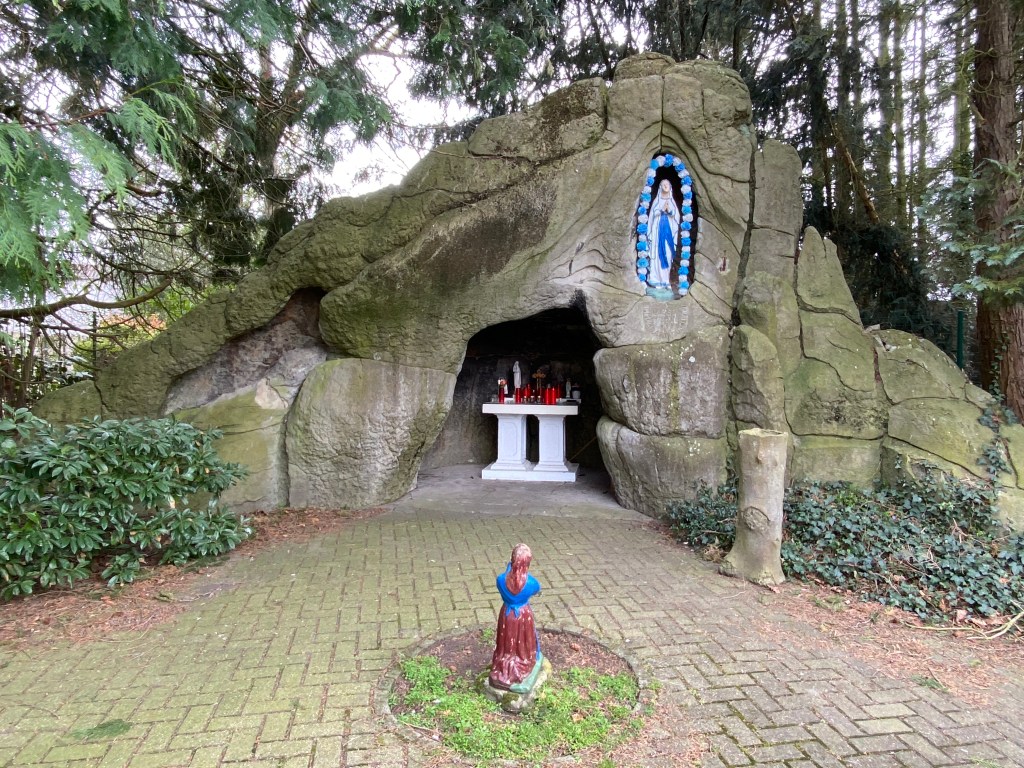 Pal naast de St. Jan Evangelist kerk op het Kolonel Slaterplein staat inderdaad een grote Lourdesgrot.