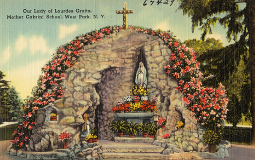 Onze-Lieve-Vrouw van Lourdes is prominent aanwezig.